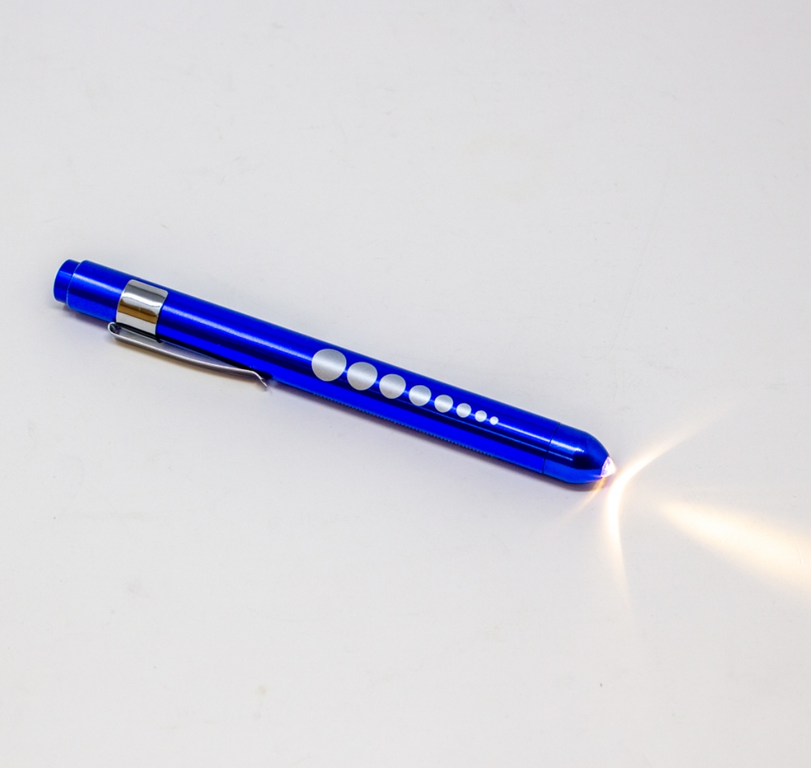 Anodized Aluminum LED penlight clips to pocket. Uses 2 “AAA” Cell batteries (Not Included). Includes holster for belt attachment. LED lasts for a lifetime. On/off push button on top. Produces a warm yellow light.
